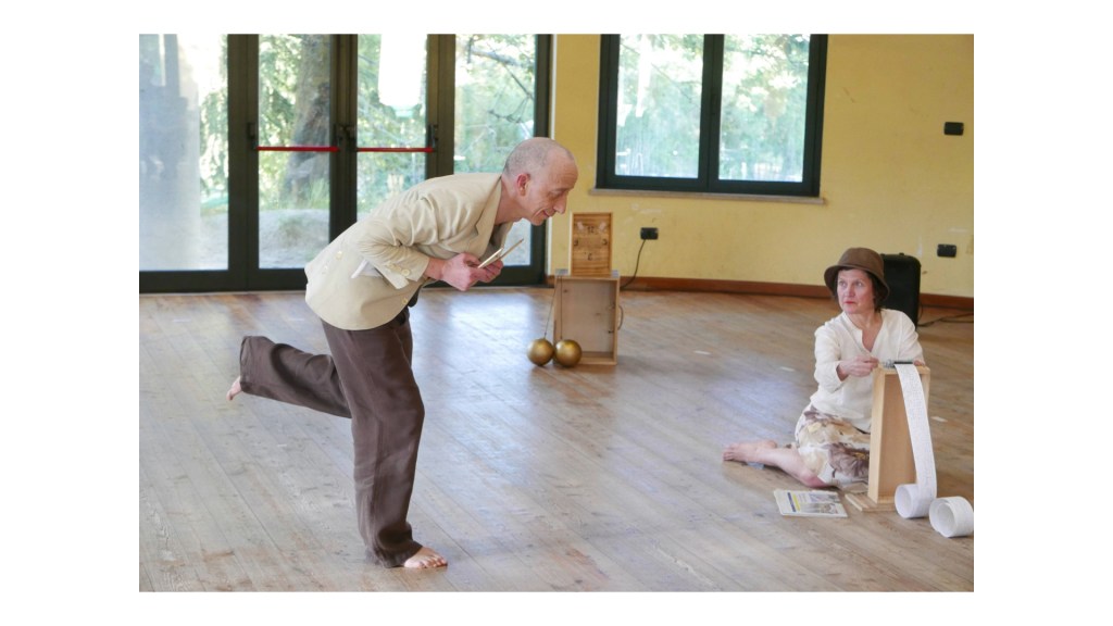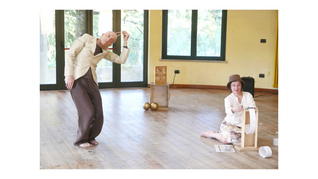 Due sfumati personaggi, dai tratti poetici a volte clown, seguendo il suono evocativo di un carillon, ci accompagnano in un viaggio musicale e associativo sulle orme del tempo. Li vediamo alle prese con semplici magie, minute danze, la nascita inusuale di un fiore. Si inseguono e si incontrano, a volte giusto in tempo a volte fuori tempo, perché il tempo si sa non è una cosa sola.